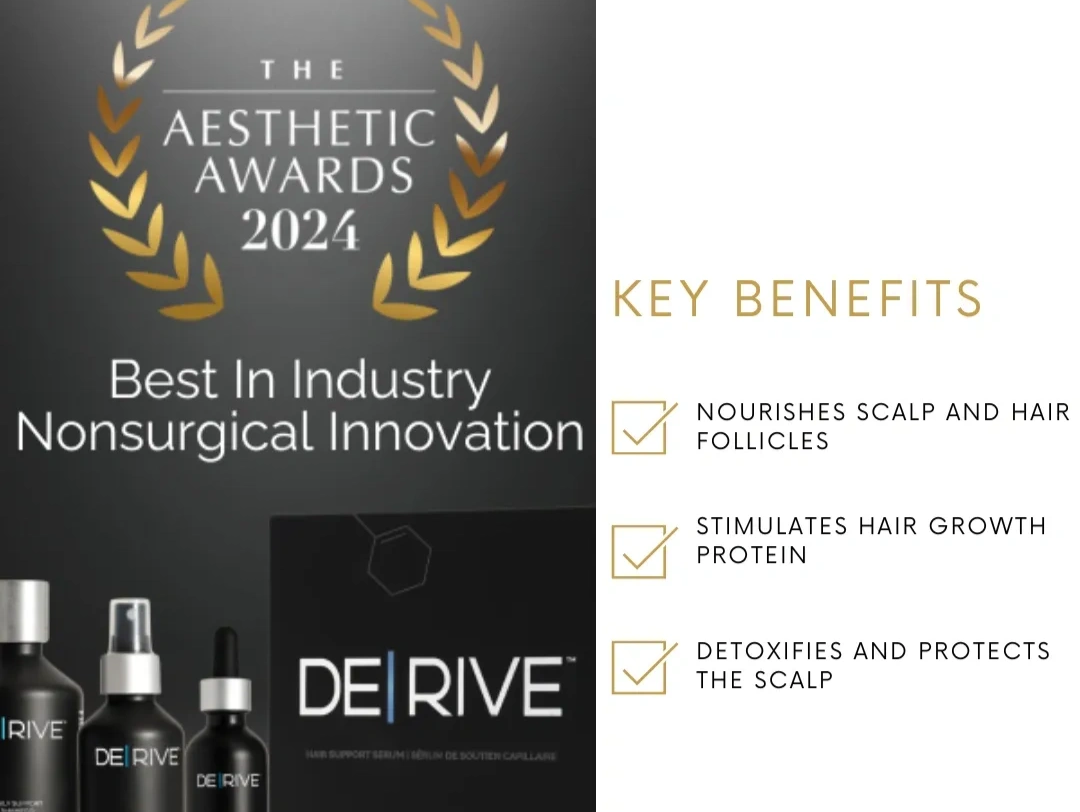 DE|RIVE is a hormone free, 100% natural plant derived serum factor that helps effectively and safely target thinning hair, promoting fuller, thicker, and healthier hair. This innovative formula combines in-office and at-home treatment.