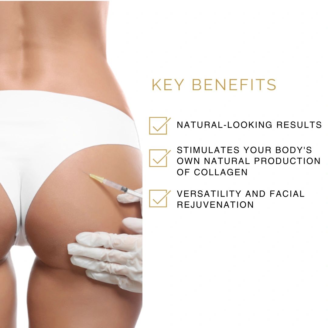 Sculptra is an FDA-approved poly-L-lactic acid biostimulator injectable treatment used to enhance your natural collagen production. This innovative dermal filler stimulates collagen production, gradually restoring volume over time and smoothing wrinkles for a more youthful appearance. Sculptra is commonly used to address age-related volume loss in the face and chest particularly in areas such as the cheeks and temples providing the natural-look appearance. Sculptra may also be used to help enhance butt augmentation with effects lasting for up to two years. Unveil the rejuvenating benefits of Sculptra and experience a refreshed, revitalized look with us.